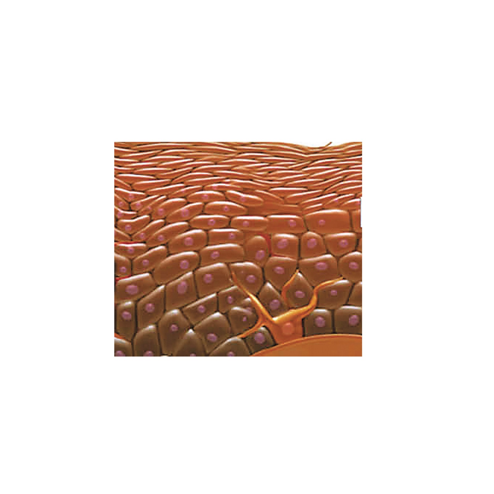 Действует как регулятор роста и активности эпителиальной ткани, незаменим для нормальной регенерации клеток кожи. Замедляет процессы ороговения и образования морщин.