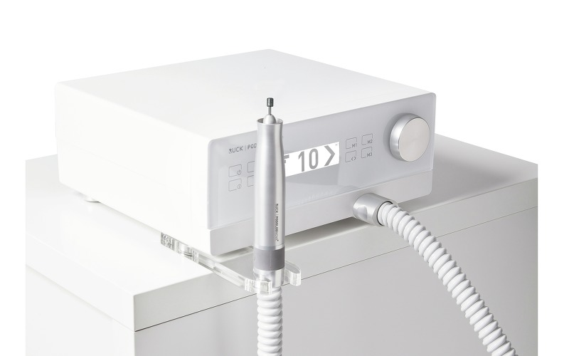 Акриловый держатель крепится за переднюю ножку корпуса педикюрного аппарата Podolog Nova 3/3s и надежно удерживает ручку мотор рядом с лицевой панелью аппарата.