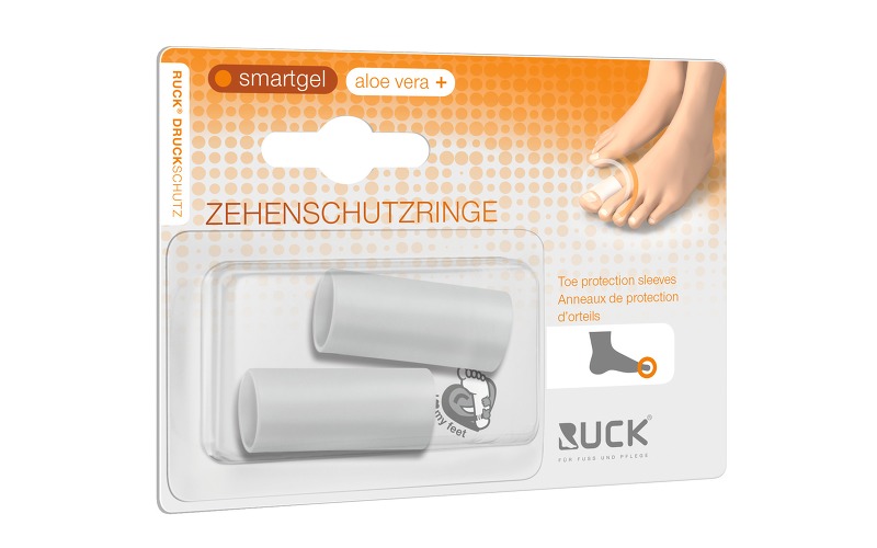 Кольцо из гель-эластомера эффективно защищает палец по всей окружности, препятствуя сдавливанию и натиранию. Выделяемое гель-эластомером минеральное масло дополнительно смягчает кожу. Применяется при межпальцевых мозолях, молоткообразных пальцах, а также при проблемах в боковых валиках.