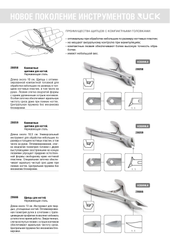 Длина около 13 см. Инструмент для твер- дых, утолщенных ногтей. Оптимизирован- ная геометрия ручек в сочетании с трапе- циевидным профилем позволяют избежать усталости во время работы. Закругленные, слегка вогнутые лезвия с острым кончиком обеспечивают идеальную чистоту среза. Центральная пружина без механизма бло- кировки.