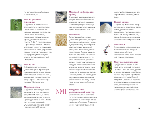 Естественный для кожи увлажняющий агент, который благодаря небольшому моле- кулярному весу легко прони- кает не только в роговой слой, но и в более глубокие слои дермы. Другое замеча- тельное свойство мочевины — ее гигроскопичность, то есть способность дополни- тельно притягивать влагу из воздуха. Она также является хорошим антисептиком, пре- красно переносится кожей и проводит в нее другие актив- ные вещества. По последним научным данным, мочевина способствует синтезу колла- гена и эластина фибробла- стами.