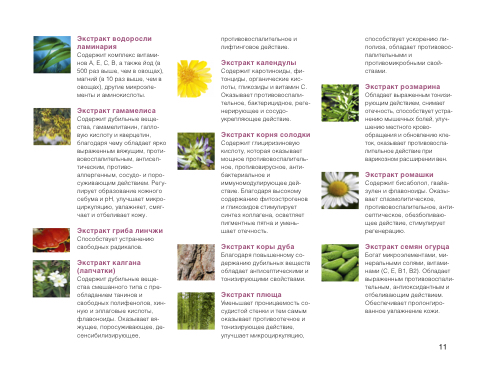 Богат микроэлементами, ми- неральными солями, витами- нами (С, Е, В1, В2). Обладает выраженным противовоспали- тельным, антиоксидантным и отбеливающим действием. Обеспечивает пролонгиро- ванное увлажнение кожи.