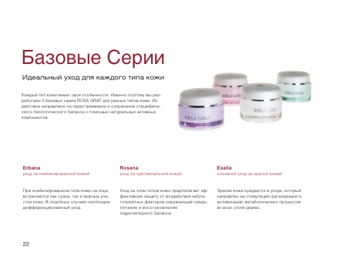 Каждый тип кожи имеет свои особенности. Именно поэтому мы раз- работали 3 базовых серии ROSA GRAF для разных типов кожи. Их действие направлено на перестраивание и сохранение специфиче- ского биологического баланса с помощью натуральных активных компонентов.