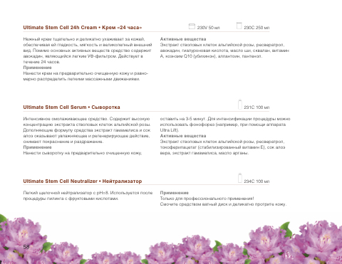 Интенсивное омолаживающее средство. Содержит высокую концентрацию экстракта стволовых клеток альпийской розы. Дополняющие формулу средства экстракт гамамелиса и сок алоэ оказывают увлажняющее и регенерирующее действие, снимают покраснение и раздражение.