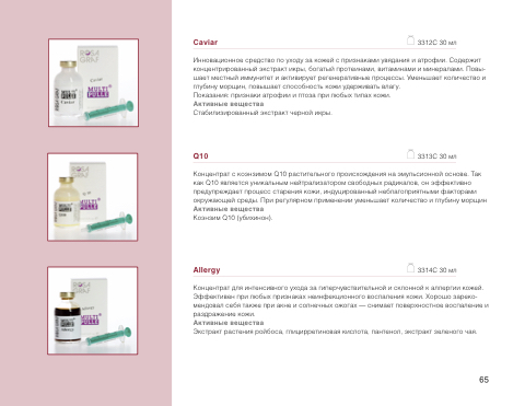 Инновационное средство по уходу за кожей с признаками увядания и атрофии. Содержит концентрированный экстракт икры, богатый протеинами, витаминами и минералами. Повы- шает местный иммунитет и активирует регенеративные процессы. Уменьшает количество и глубину морщин, повышает способность кожи удерживать влагу.