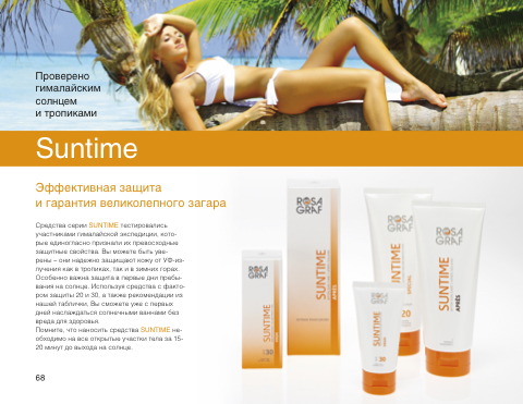 Средства серии SUNTIME тестировались участниками гималайской экспедиции, кото- рые единогласно признали их превосходные защитные свойства. Вы можете быть уве- рены – они надежно защищают кожу от УФ-из- лучения как в тропиках, так и в зимних горах. Особенно важна защита в первые дни пребы- вания на солнце. Используя средства с факто- ром защиты 20 и 30, а также рекомендации из нашей таблички, Вы сможете уже с первых дней наслаждаться солнечными ваннами без вреда для здоровья.