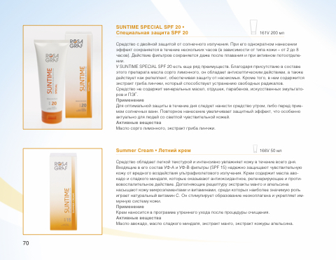 У SUNTIME SPECIAL SPF 20 есть еще ряд преимуществ. Благодаря присутствию в составе этого препарата масла сорго лимонного, он обладает антисептическим действием, а также действует как репеллент, обеспечивая защиту от насекомых. Кроме того, в нем содержится экстракт гриба линчжи, который способствует устранению свободных радикалов. Средство не содержит минеральных масел, отдушек, парабенов, искусственных эмульгато- ров и ПЭГ.