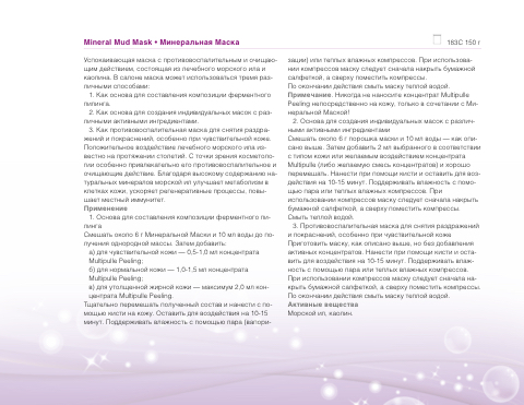 Успокаивающая маска с противовоспалительным и очищаю- щим действием, состоящая из лечебного морского ила и каолина. В салоне маска может использоваться тремя раз- личными способами: